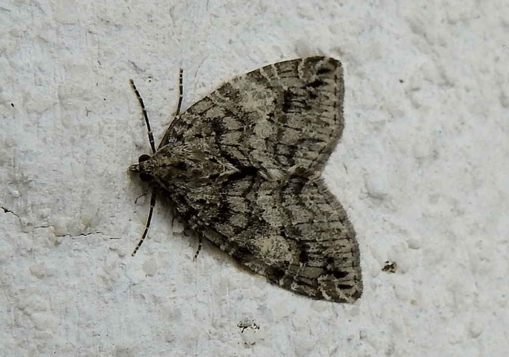 Val George writes:  This moth, Hydriomena nubilofasciata, was on the wall of my Oak Bay house yesterday morning, February 16.