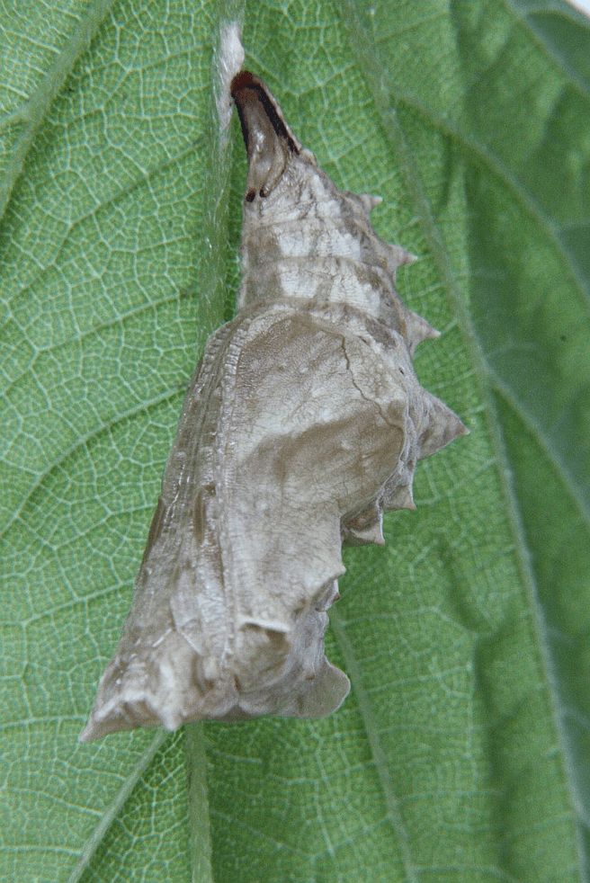 The Satyr Comma caterpillar shown on June 9 has now formed a chrysalis: