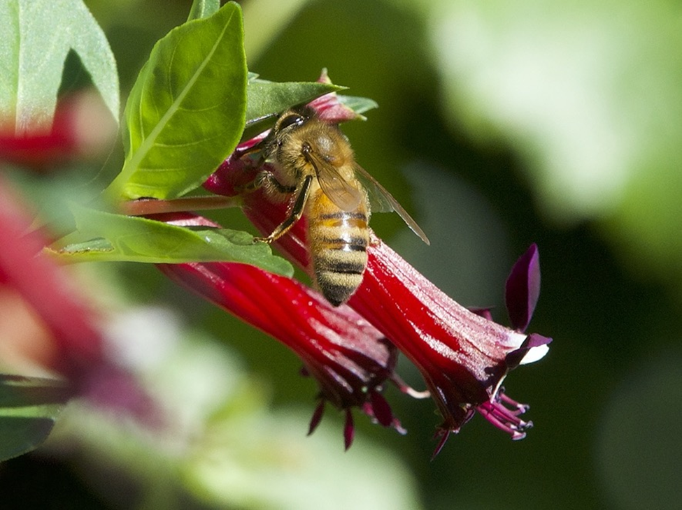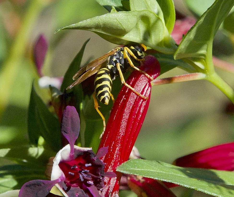 Bruce Whittington sent some photographs of a wasp and a bee from Ladysmith. Although they are not strictly recent photographs, they will maybe nevertheless interest viewers. The first shows a European Paper Wasp apparently biting into the base of a Cuphea flower to reach some nectar or pollen. The second shows a Honey Bee that may not be trying to do exactly the same thing itself, but may be trying to take advantage of a hole previously bitten into by the wasp.
