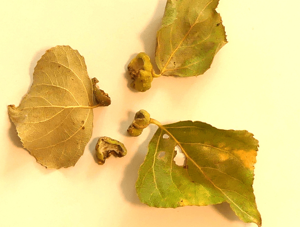 Jochen Möhr sends pictures of galls on the petioles of some poplar (cottonwood) leaves. These are formed by aphids of the species Pemphigus spirothecae.