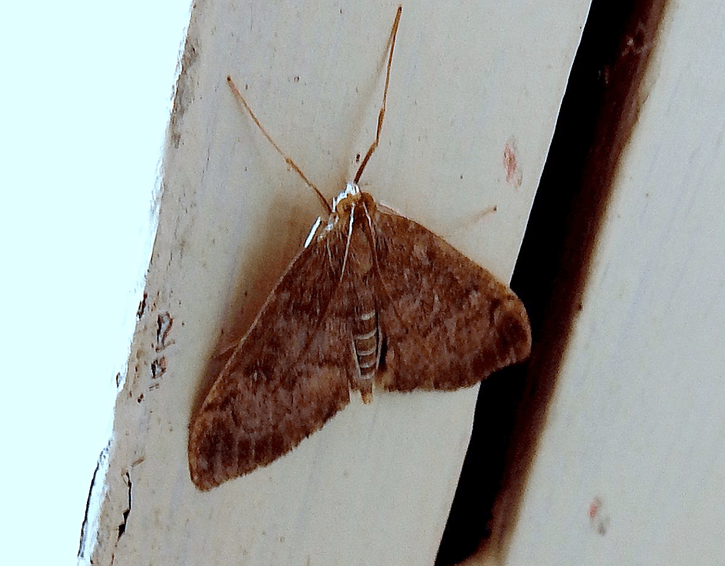 Jeremy Tatum writes: I had one of these at my Saanich apartment building this morning. It is difficult to be certain of the identification of these and similar moths – the Subfamily Scopariinae may need further study and possible revision.