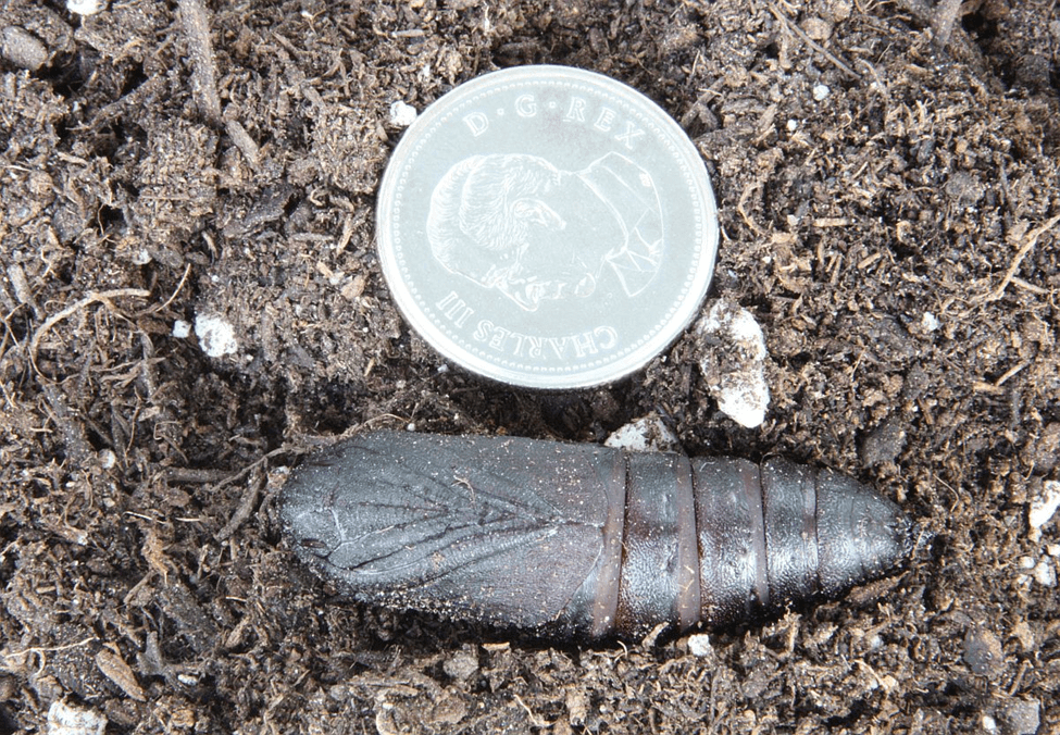 Below is the pupa formed by Jochen Möhr’s caterpillar (shown on July 29) of an Eyed Hawk Moth (the Ophthalmic kind, you know), being admired by His Majesty. The coin is a quarter, by the way, not a dime.